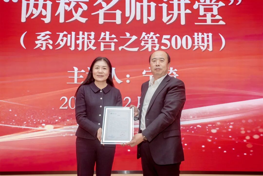 郝曙光代表学校向宁琦教授送上感谢信。他表示,烟台大学自1984年建校以来,始终承载着北京大学、清华大学无私援建的深情厚谊与学术血脉,坚持开放办学、重视学科交叉、致力人才培养。四十余年来,两校在师资、管理、科研等方面持续给予烟台大学大力支持,为烟大建设发展注入了源源不断的智慧与力量。恰逢“北大、清华两校名师讲堂”举办第500期,外语学科与高等教育领域著名学者、管理专家宁琦教授来校作专题报告,系统剖析了外语学科面临的困境和发展路径,为烟台大学外语学科发展带来重要启迪,更是两校学术血脉与深情厚谊在新时代的生动延续。烟台大学将继续传承北大、清华援建基因与开放精神,持续推进高水平大学建设和学科高质量发展,书写学科建设与人才培养新篇章,为强国建设、民族复兴伟业作出新的更大贡献。