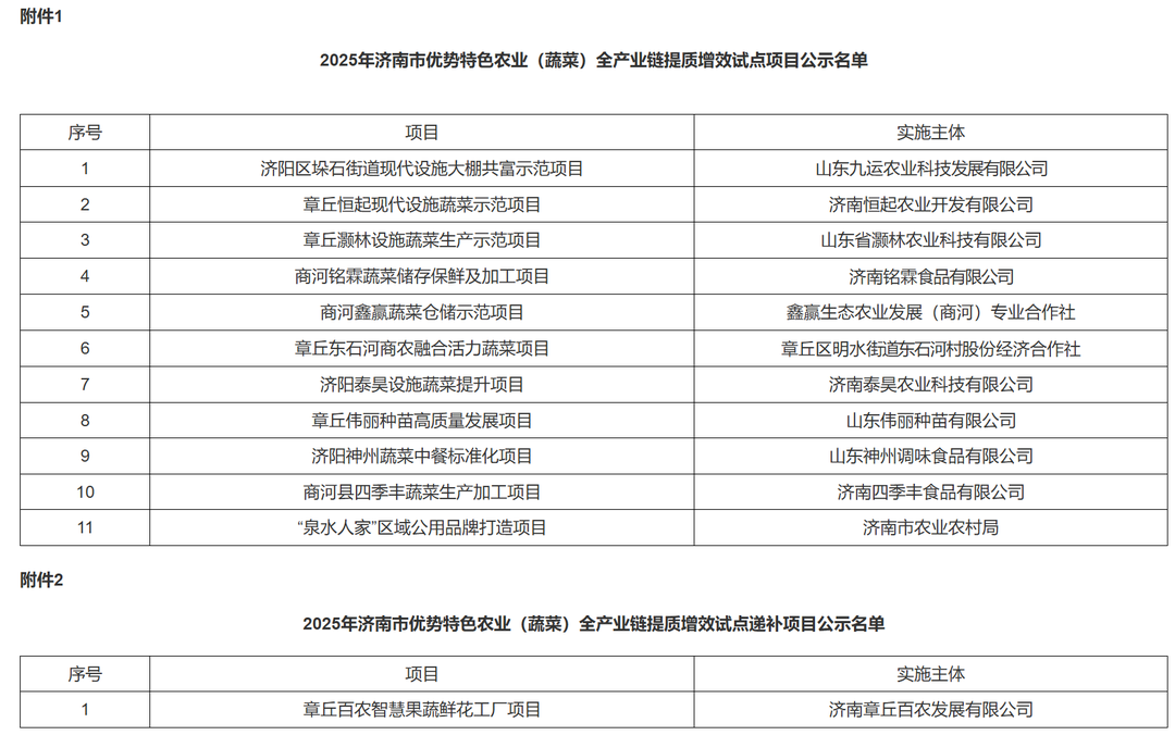 济南公示2025年优势特色农业(蔬菜)全产业链提质增效试点项目