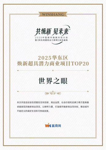在港区整体能级提升的背景下,作为核心地标项目的“世界之眼”脱颖而出,荣获“2025华东区域市焕新超具潜力商业项目TOP20”,成为华东地区商业焕新领域一颗备受瞩目的新星。
