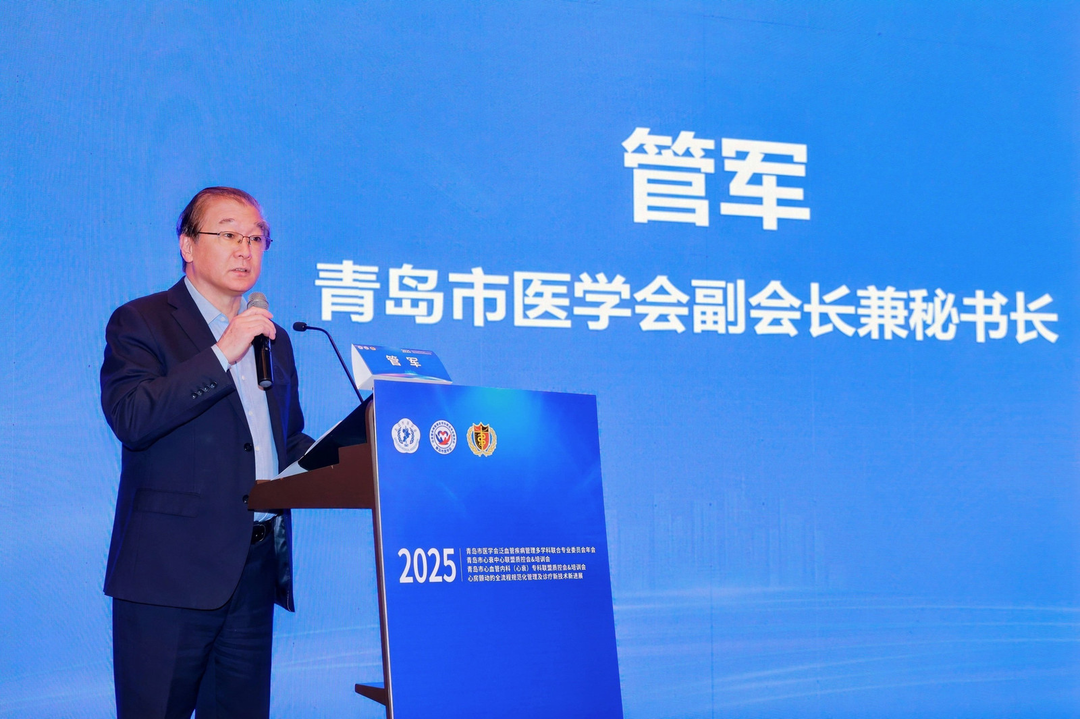 青岛市医学会副会长兼秘书长管军教授代表学会对大会的召开表示祝贺。他回顾了青岛市心血管学科建设的发展历程,高度肯定了泛血管专委会成立一年来在促进多学科协作方面所做的开创性工作。管军秘书长强调,医学会将继续搭建高水平的学术平台,支持跨学科交流与合作,并希望通过持续的质量控制与培训,夯实青岛市心脑血管疾病的防治网络,为健康青岛建设贡献专业力量。