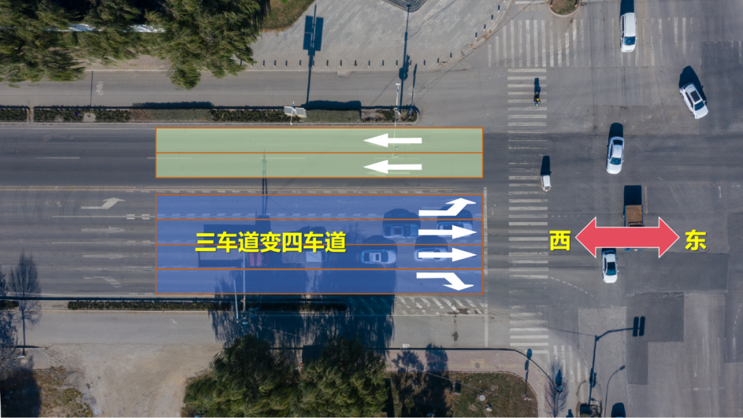 优化车道:升级为双向四车道,对路口重新渠化,增加路口导向线,引导左转车辆。