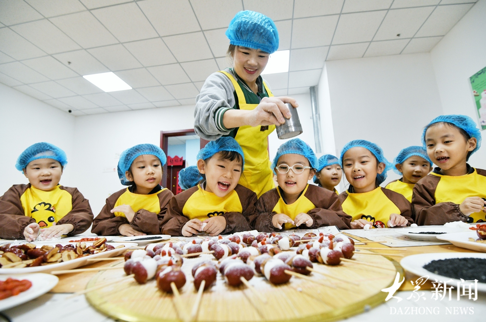 12月19日,乐陵市天和嘉园幼儿园,小朋友在老师的指导下制作面点,练习手鼓舞。