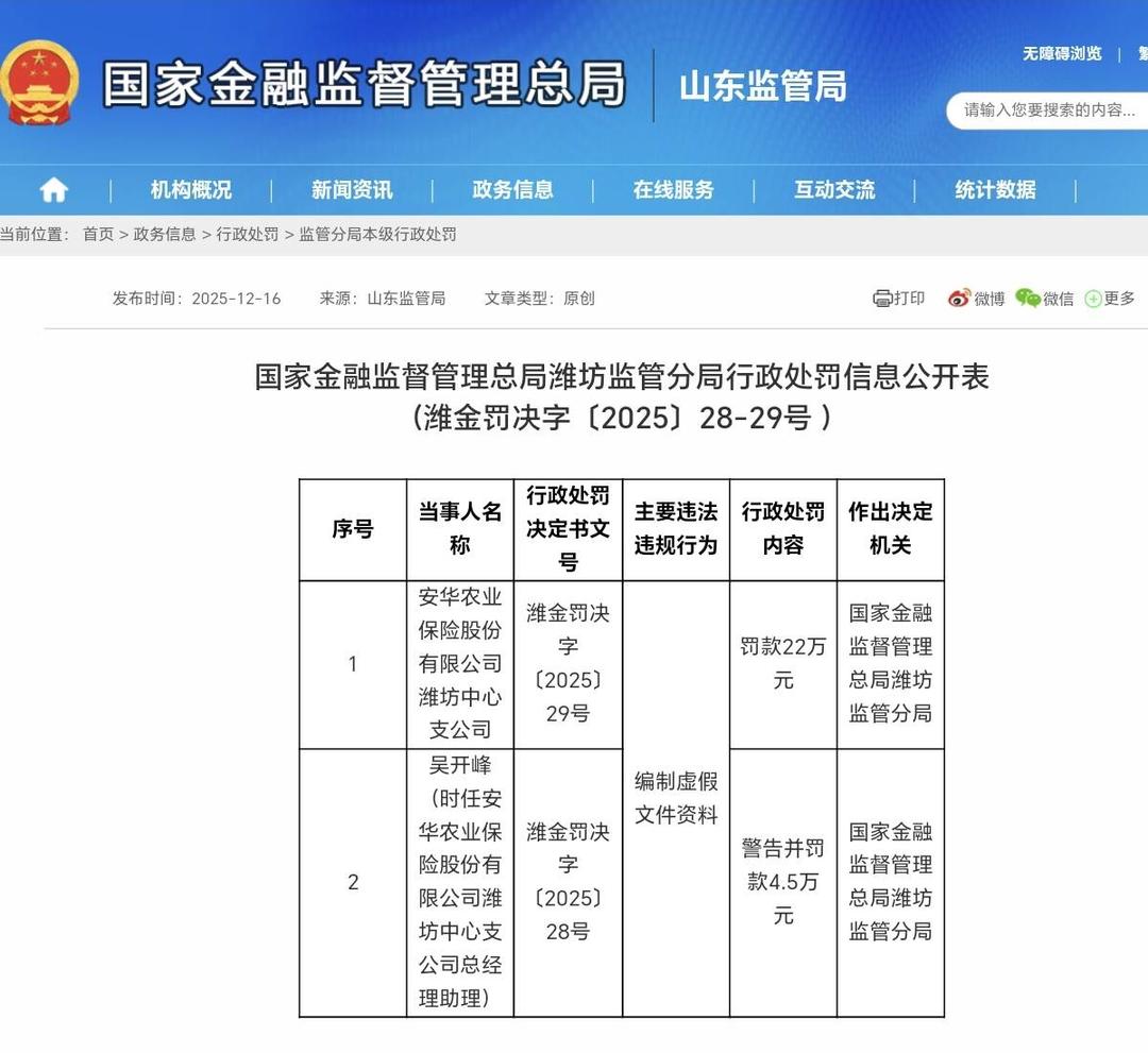 12月16日,国家金融监督管理总局潍坊监管分局发布行政处罚信息公开表(潍金罚决字〔2025〕28-29号 ),公开表显示安华农业保险股份有限公司潍坊中心支公司因编制虚假文件资料被罚款22万元。同时,时任安华农业保险股份有限公司潍坊中心支公司总经理助理吴开峰因编制虚假文件资料,被警告并罚款4.5万元。