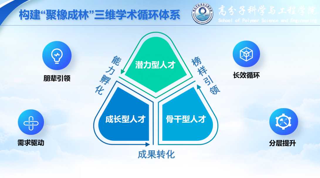 今年以来,青岛科技大学高分子学院研团委提出了“聚橡成林”循环学术培养体系。针对不同年级研究生的成长需求,创新性构建“潜力型、成长型、骨干型”三阶段梯度培养计划,为研究生科研能力与综合素养实现全方位赋能。