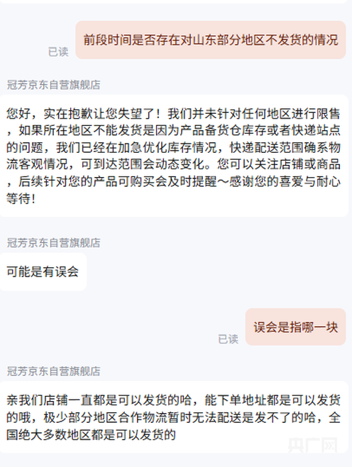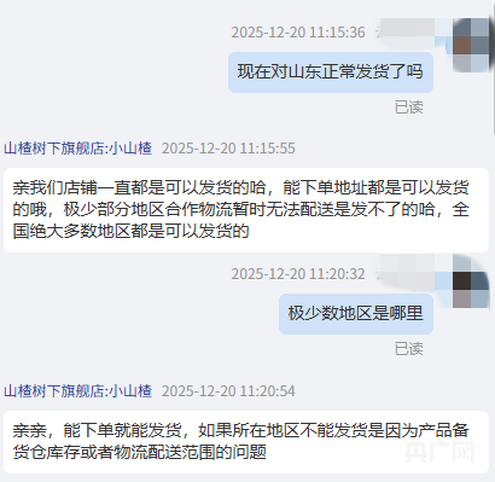 12月20日,记者以消费者身份在淘宝、京东、拼多多等多个电商平台的“山楂树下旗舰店”“冠芳旗舰店”进行了咨询。记者询问“现在对山东正常发货了吗”,平台客服回应称店铺一直可以发货,“能下单地址都是可以发货的”。随后记者询问“前段时间是否存在对山东部分地区不发货的情况”,其中一客服回应称“可能是有误会”。当记者进一步询问“误会是指什么”,客服回复称“能下单地址都是可以发货的”。