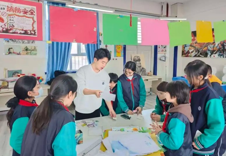 这类将传统工艺引入课堂的实践,正是支教志愿者们拓展美育内涵、连接古今文化的用心所在。一批批充满朝气的支教大学生志愿者,将青春汗水挥洒在英吉沙的校园里。他们不仅注重技能传授,更致力于通过生动体验唤醒文化认同。他们积极投身一线教学,并利用课余时间开设兴趣小组、进行一对一课业辅导,有效弥补了基层教育资源短板。他们不仅是知识的传授者,更是孩子们的陪伴者和倾听者,特别关注留守儿童,通过谈心交流、心理疏导给予温暖关怀。他们还积极参与校园文化建设,组织丰富文体活动,用青春的激情点燃边疆学子对未来的憧憬,为教育振兴注入源源不断的青春动能。