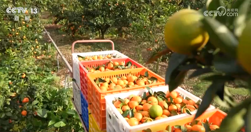 不仅采摘有技巧,运输也用上了新工具。今年果农们引入了大型载重无人机,一次可以吊运100公斤左右的鲜果,运输效率比过去肩挑背扛提升了7倍,特别适合这种地处偏远、交通不便的果园。而地面上也建设了3公里的轨道,轨道运输车可以做到“上山拉肥料,下山拉柑橘”,大大降低了运输成本。