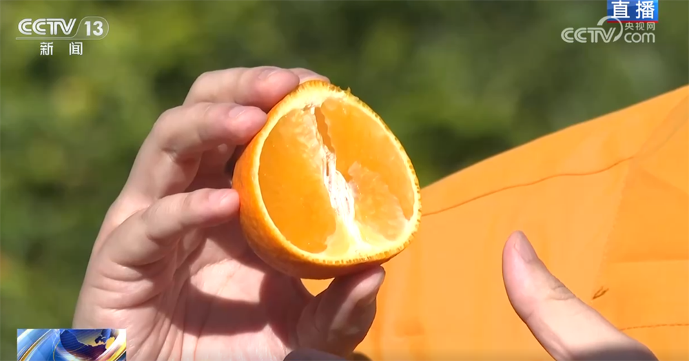 这里的柑橘有什么优势呢?皮薄、汁多、甜度高。您看,皮非常薄,只有2—3毫米,中间的果肉隔膜也是薄如蝉翼,所以整个果实的可食率达到76.8%,汁水也很多。此外,糖度也是衡量品质的关键,我们来检测一下它有多甜。您看,数值显示达到了11.9,这是什么概念呢?我们常吃的西瓜的糖度一般是12度左右,说明它的含糖量还是非常高的。