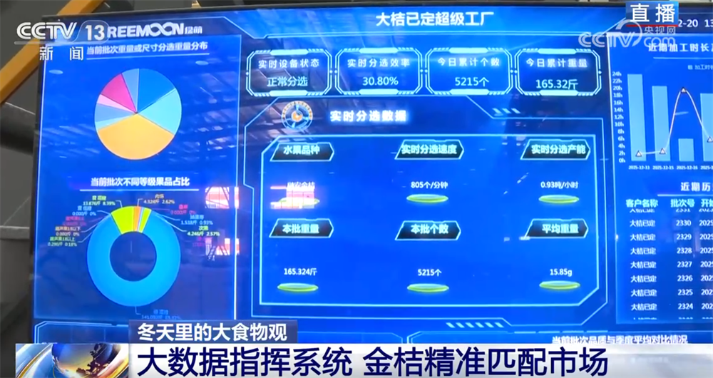 记者来到了融安一家金桔数字化产地仓,可视化大数据指挥系统的屏幕可以实时显示正在分拣的金桔的相关数据,包括果子的大小、成熟度、糖度、重量、色泽等等,保证经过分选的金桔更加精准地匹配到目标消费人群。