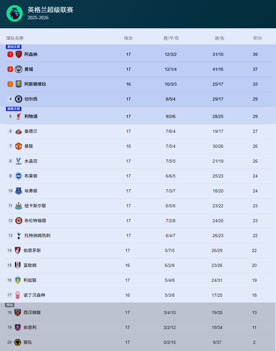 阿森纳客场1-0战胜了埃弗顿,英超联赛积分39分。