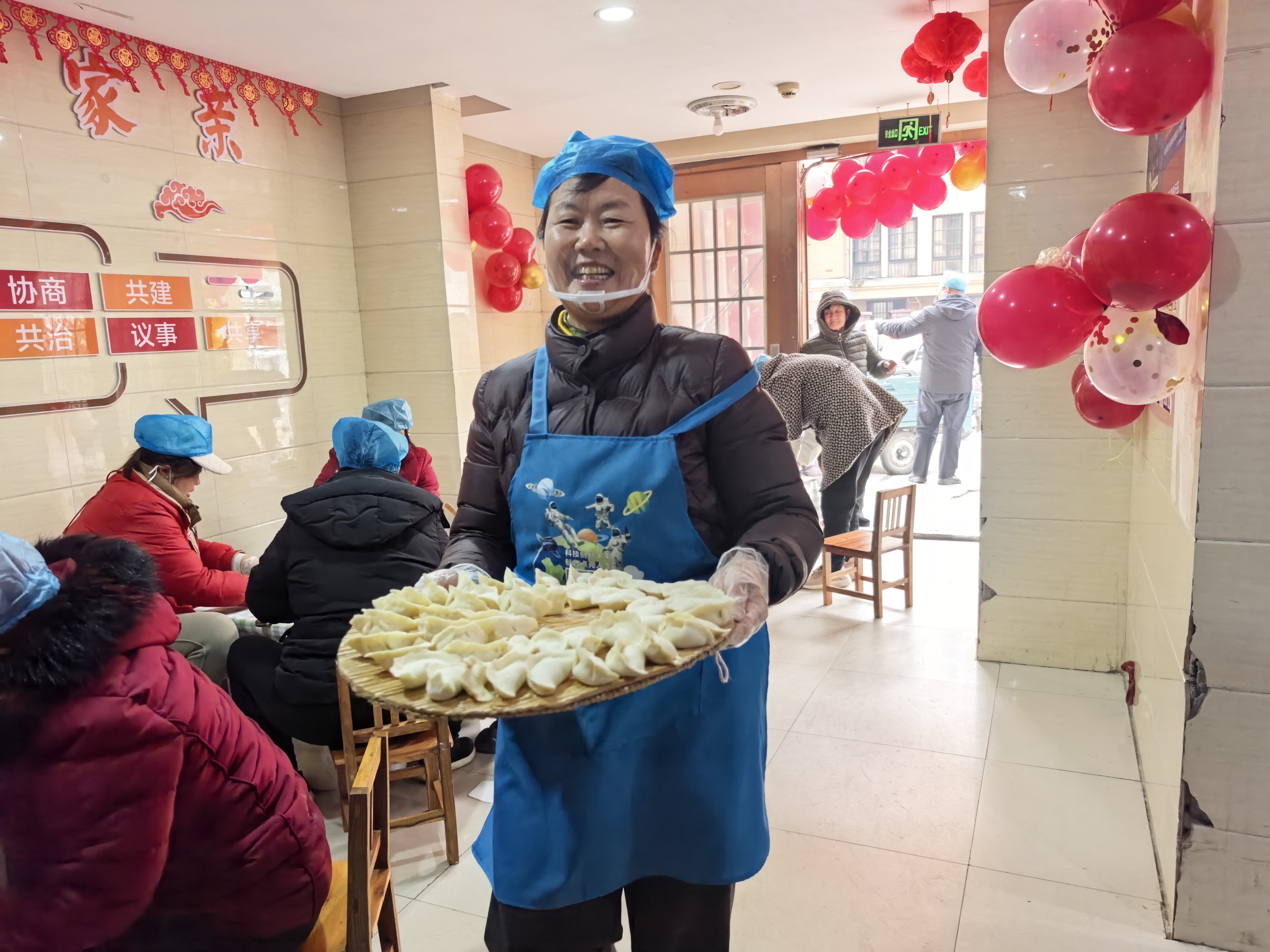 活动现场热闹非凡,社区工作人员与居民早早来到单元门厅,和面、擀皮、调馅、包饺子,分工协作、有条不紊。大家围聚在一起,一边娴熟地捏出一个个饱满的饺子,一边聊家常、聊趣事,欢声笑语回荡在门厅内。不一会儿,一排排形态各异的饺子便摆满托盘,浓郁的香气四处弥漫,温馨和睦的氛围感染着在场的每一个人。