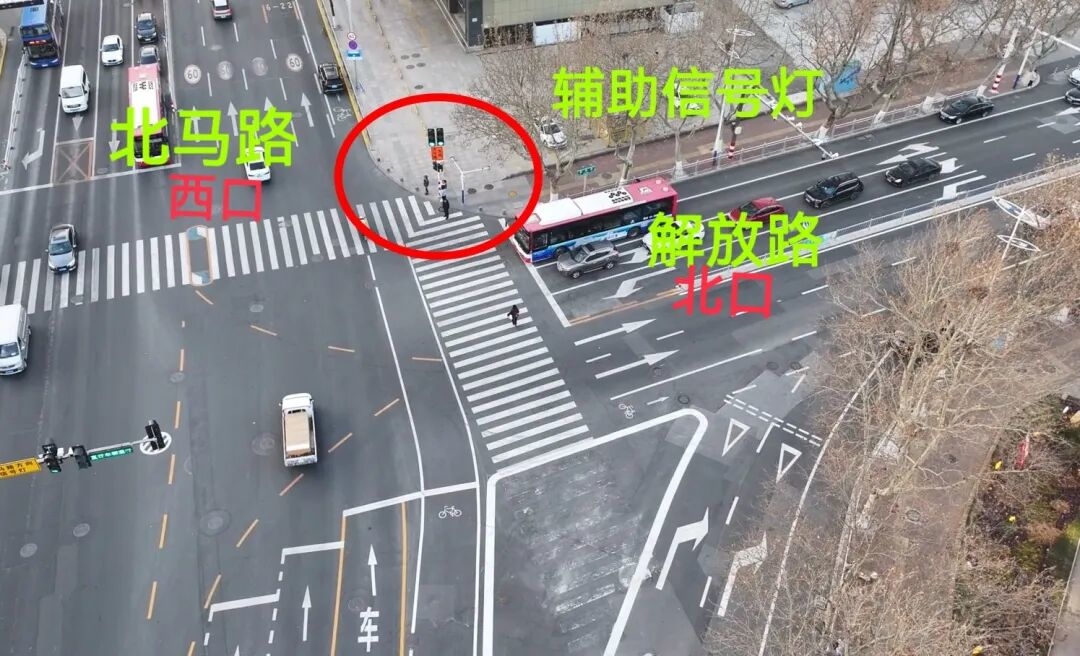 特别提醒:东口新增辅助信号灯,增加了“大马路方向”标志:指示从大马路方向进入待行区的车辆要按信号灯指示通行,从南口解放路方向来的车辆不受信号控制。