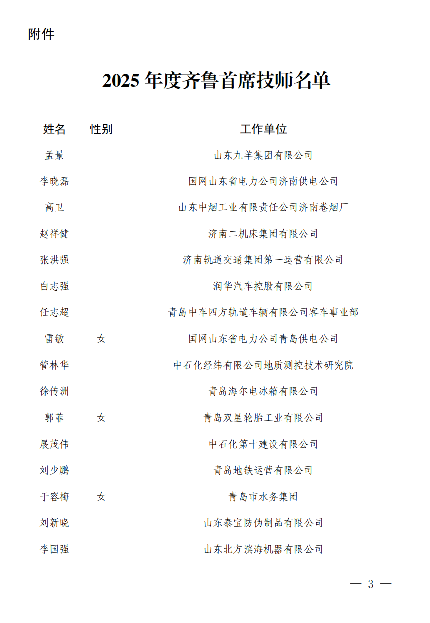 各市党委组织部、政府人力资源社会保障局、财政局,省直各有关部门,各省属企业,中央驻鲁有关单位:根据《齐鲁首席技师选拔管理办法(暂行)》(鲁人社字〔2021〕154号),经逐级推荐、选拔、考察公示等程序,确定孟景等150人为2025年度齐鲁首席技师,现予以公布。