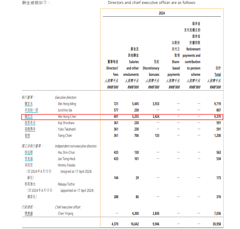 财报显示,魏宏丞2024年度“薪金及其他酬金”为525.5万元,“董事袍金”为69.1万元,“花红”为342.4万元,合计达到937万元。