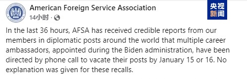 声明表示,在过去36小时内,该协会从美国驻世界各地的外交机构收到的可靠报告显示,多名在拜登政府时期任命的驻外大使接到电话,被要求在明年1月15日或16日之前离职。对方并未对要求这些大使离职给予任何解释。