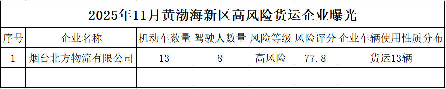 为进一步加强道路运输企业和重点车辆及驾驶人道路交通安全管理全面落实交通安全主体责任从源头遏制事故隐患有效预防和减少道路交通事故现对烟台黄渤海新区11月份被列为高风险运输企业分数越低风险越高进行曝光请高风险运输企业认真做好重点车辆及驾驶人隐患整改工作严格落实企业安全主体责任加强从业人员安全生产教育夯实源头管理基础确保道路交通运输安全高风险货运企业