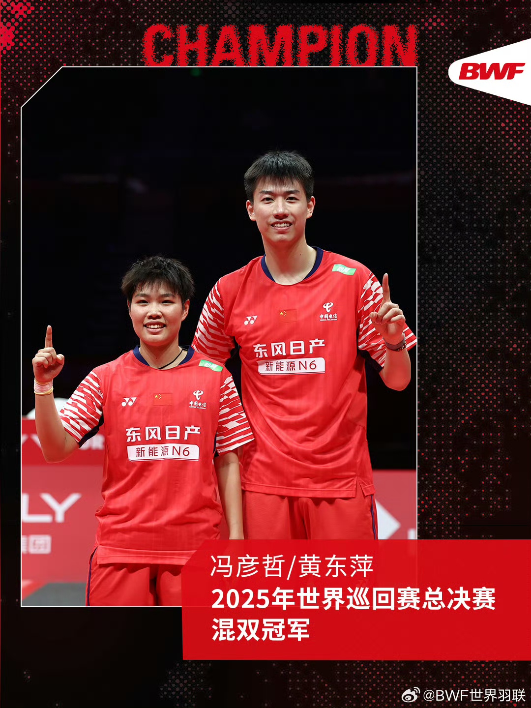 冯彦哲/黄东萍夺得世界羽联世界巡回赛总决赛混双冠军快讯 | 2025-12-21 15:07:28 微信扫码扫码下载客户端12月21日,2025年世界羽联世界巡回赛总决赛在浙江杭州展开五项决赛。在刚刚结束的混双决赛中,中国队组合冯彦哲/黄东萍以2:0战胜队友组合蒋振邦/魏雅欣,夺得冠军。蒋振邦/魏雅欣获得亚军。责任编辑:金雪