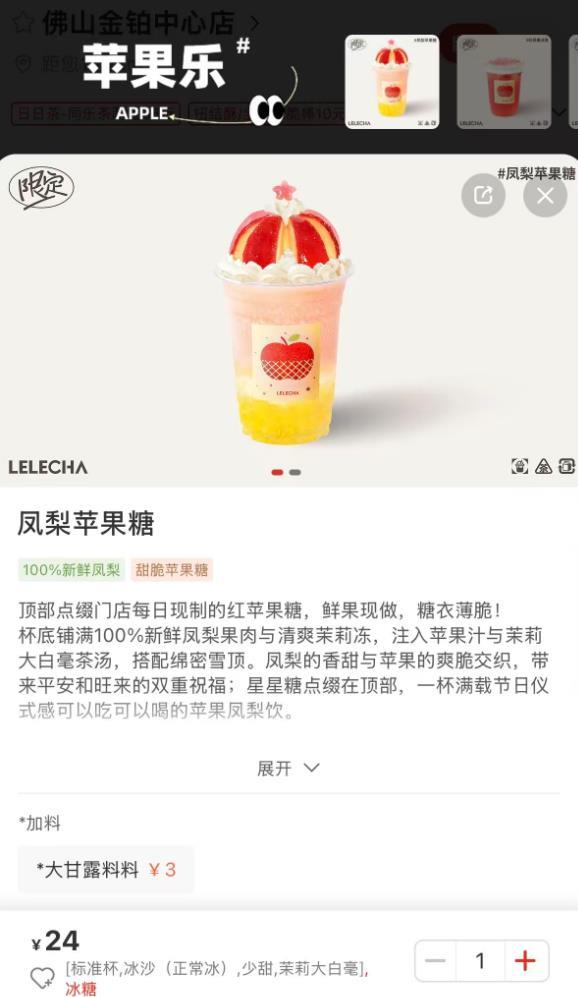 极目新闻记者看到,该系列产品在乐乐茶小程序上售价为:“凤梨苹果糖”单杯24元,另加“一颗苹果糖”需9.9元。12月20日晚,乐乐茶在声明中表示:“这次由于我们自身考虑不周、准备不足,导致出品不够稳定,影响了大家的体验。”