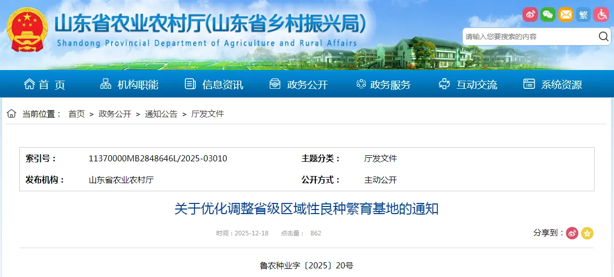 近日,山东省农业农村厅网站发布关于优化调整省级区域性良种繁育基地的通知