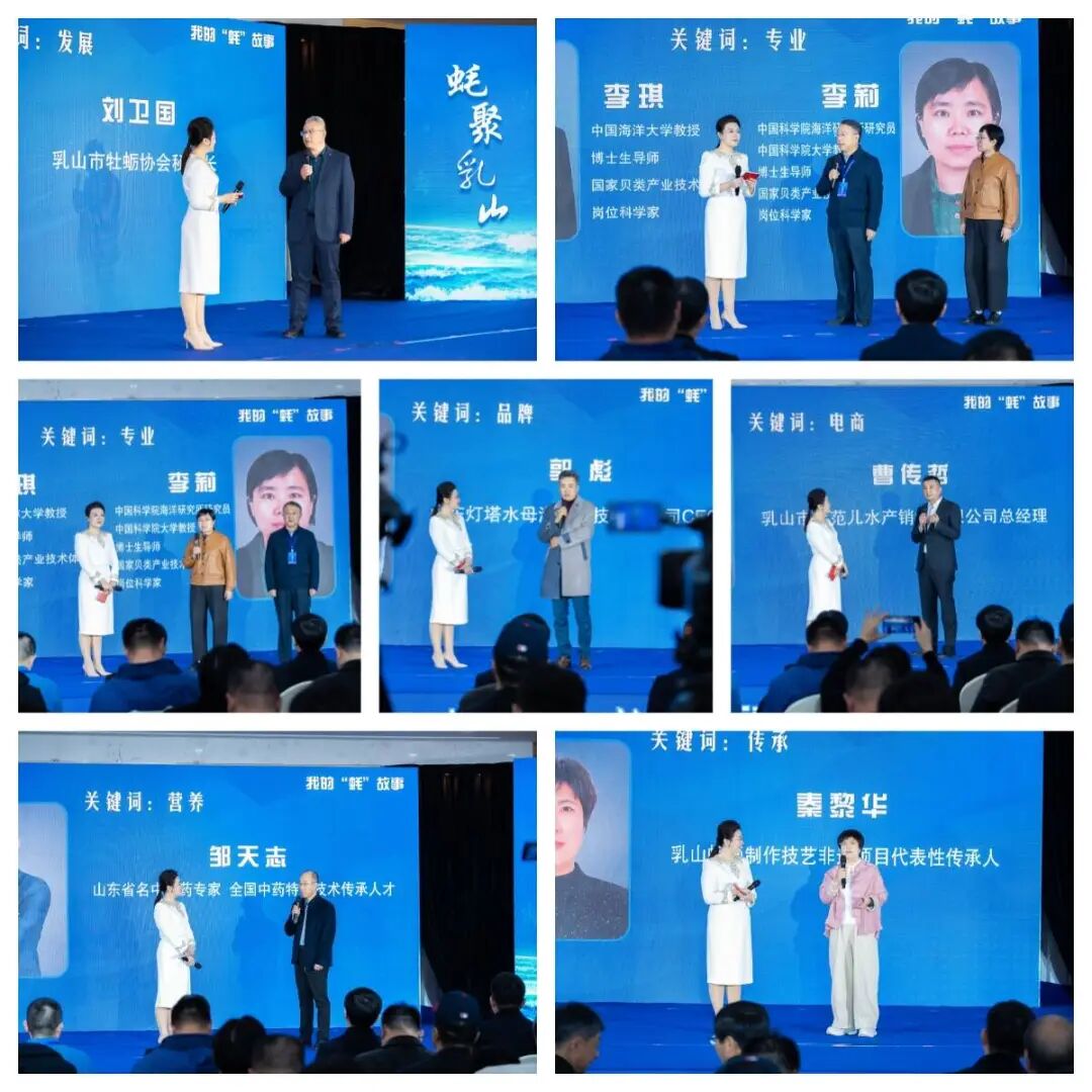 最触动人心的《我的“蚝”故事》互动访谈环节,六个关键词串联起产业发展的生动图景。乳山市牡蛎协会秘书长刘卫国以“发展”为核,将他与乳山牡蛎的结缘以及品牌保护之路娓娓道来;中国海洋大学李琪教授,中科院海洋研究所研究院、中国科学院大学李莉教授以“专业”为翼,分享在品种改良、技术革新过程中的科研坚守;山东灯塔水母海洋科技有限公司CEO郭彪以“品牌”为要,讲述深耕市场、打响乳山牡蛎名号的匠心历程;乳山市蚝范儿水产销售有限公司总经理曹传哲以“电商”为桥,细数在线上销售领域的探索与突破;山东省名中医药专家、全国中药特色技术传承人才邹天志以“营养”为题,从专业角度解读乳山牡蛎的营养价值;乳山蛎画制作技艺非遗传承人秦黎华以“传承”为脉,透过牡蛎画讲述山海之间的文化情缘,一个个鲜活故事让现场嘉宾深受触动。