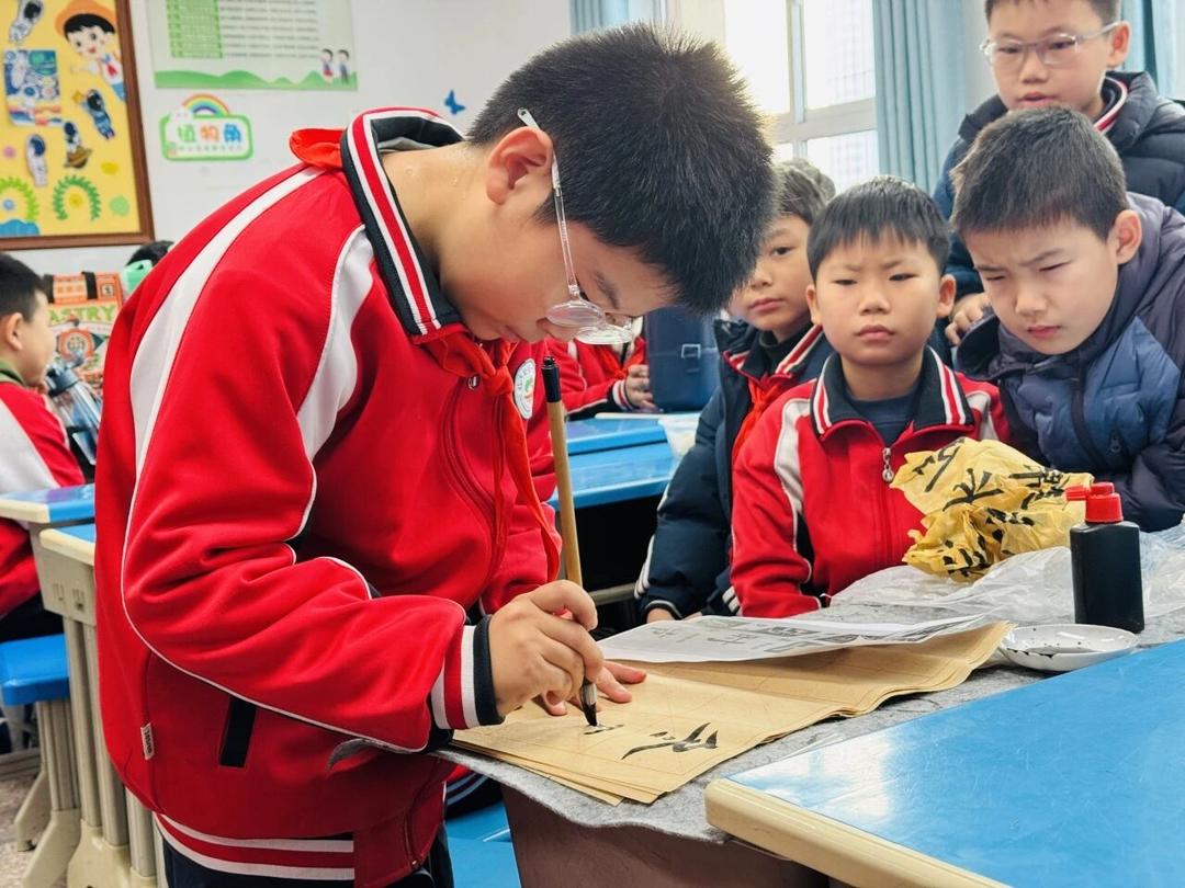随后的文化体验环节,同学们纷纷化身“冬至文化小使者”。有的手持精心绘制的手卡,生动讲解冬至的起源与习俗;有的齐声朗诵《冬至数九歌》,童声朗朗中传递着古老节气的时序之美;在书法体验区,几人一组提笔蘸墨,在红纸上认真写下“冬至阳生春又来”等诗句,笔触虽稚嫩,却满含对传统文化的亲近之心。