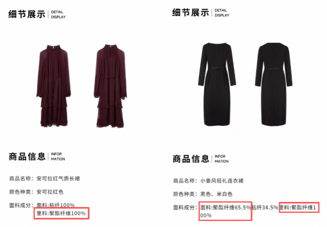 依然有聚酯纤维。在天猫榜单中登上国际知名女装品牌榜的PORTS宝姿,就有不少连衣裙的主要成分是聚酯纤维。吊牌价4299元的修身无袖连衣裙的成分表标明,面料的聚酯纤维含量有94%,吊牌价分别为6299元、5999元的长袖连衣裙和气质修身连衣裙的成分是100%聚酯纤维。