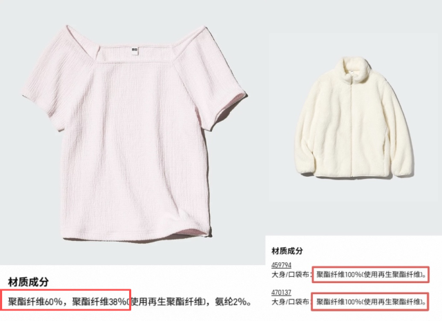 优衣库标价39元的短款上衣,材质成分界面写着聚酯纤维含量60%,再生聚酯纤维含量占38%。卖爆的摇粒绒外套,大身和口袋布的材质是100%聚酯纤维。