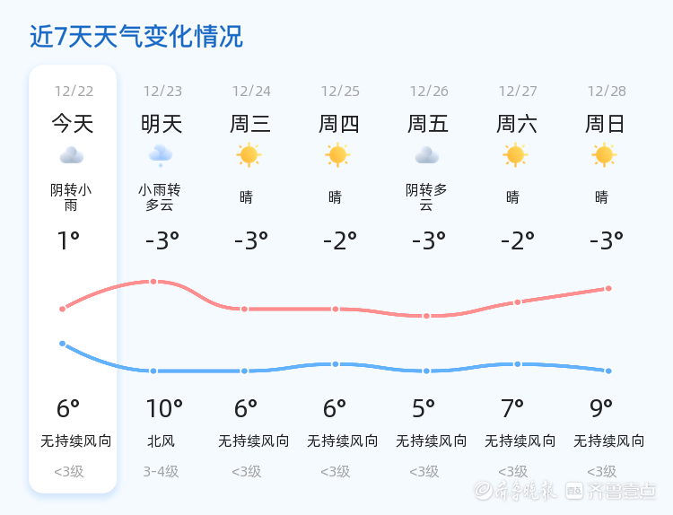 未来三天(12月22日至24日),济宁市天气将以阴雨天气为主,其中25日开始转为晴好天气,气温波动较大,最低气温为-3℃,最高气温为10℃。市民需关注天气变化,及时增减衣物,出行时请注意携带雨具,防范道路湿滑。