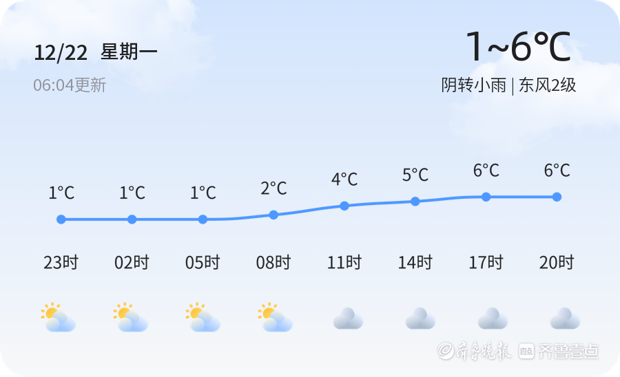 今天是12月22日(星期一),农历十一月初三。济宁市今日天气阴转小雨,气温在1℃到6℃之间,东风2级,相对湿度48%,空气质量良好(PM2.5为45)。各区天气情况基本一致,均为阴转小雨,气温适中,体感略凉。