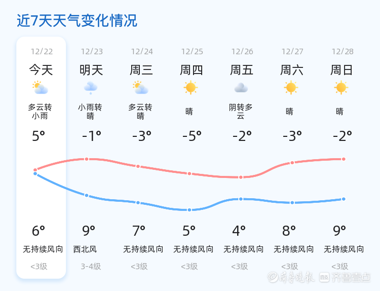 今天是12月22日,星期一,农历十一月初三。临沂市今日天气多云转小雨,气温在5℃至6℃之间,东北风2级,空气湿度为58%,PM2.5指数为40,空气质量良好。各区天气情况基本一致,均为多云转小雨,风力不大,适合市民出行。