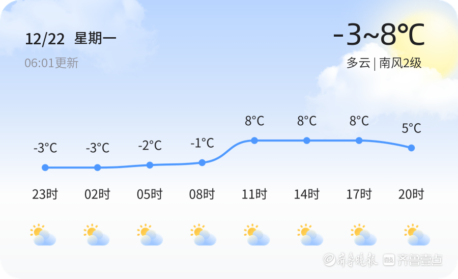今天是12月22日,星期一,农历十一月初三。淄博市今日天气多云,气温介于-3℃至8℃之间,南风2级,空气湿度32%。空气质量指数为良好,PM2.5浓度为47微克/立方米,对人体健康影响较小。市民可适当进行户外活动,但需注意早晚温差较大,及时增减衣物,以防感冒。