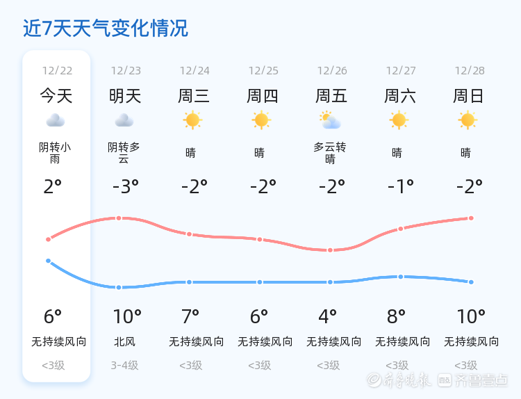 明天(12月23日)菏泽天气将转为阴转多云,气温有所下降,最低气温-3℃,最高气温10℃,北风3-4级。与今日相比,明天天气晴朗程度有所改善,但气温波动较大,市民需注意保暖,适时增减衣物。