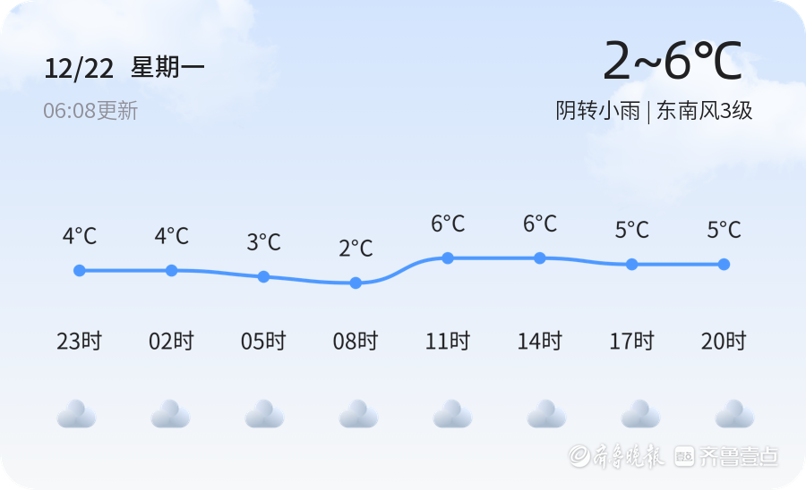 今天是12月22日,星期一,农历十一月初三。菏泽市今日天气为阴转小雨,气温较为温和,最低气温2℃,最高气温6℃。目前实时温度为2.7℃,东南风3级,空气湿度56%,PM2.5指数57,空气质量良好。今日菏泽各区天气情况基本一致,均为阴转小雨,市民出行需携带雨具,注意防寒保暖。