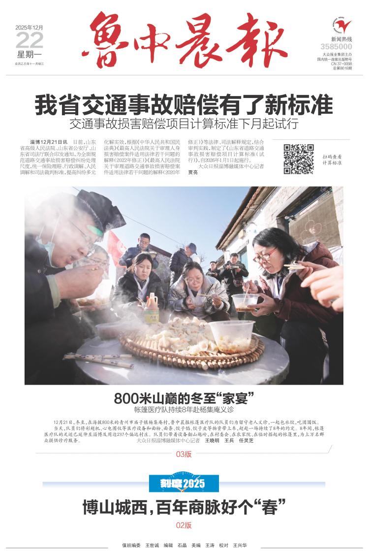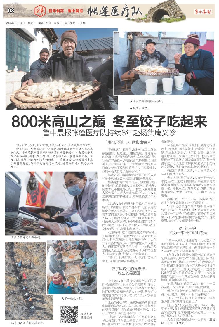 12月21日,冬至,在海拔800米的青州市庙子镇杨集庵村,鲁中晨报帐篷医疗队的队员们为留守老人义诊,一起包水饺,吃团圆饭。