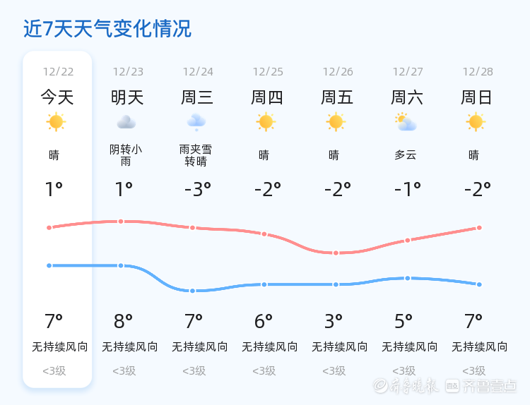 今日是2025年12月22日,星期一,农历十一月初三。济南今天以晴转阴的天气为主,气温在1℃至7℃之间,东南风1级,空气湿度为29%,PM2.5指数为51,空气质量良好。全市各区天气情况相似,市民出行需注意随身携带雨具,以应对天气变化。