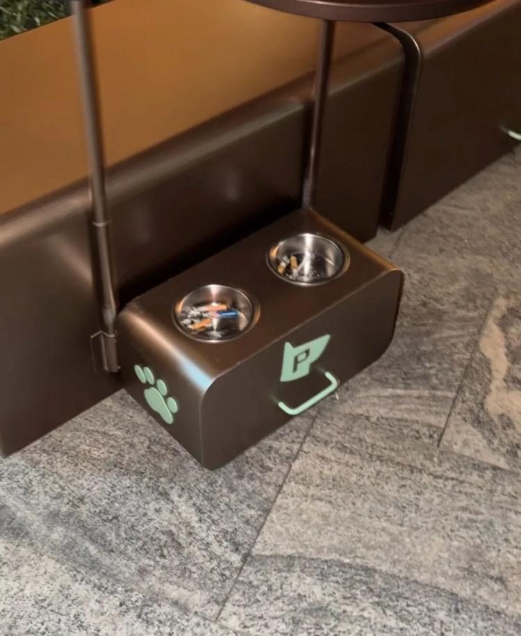 近日 ,有IP地址为陕西的网友发帖称,在西安万象城,两个用作宠物喝水的水碗,被放进了少量烟头与烟灰。根据发帖网友晒出的图片,在一印有狗爪与狗头图案的金属盒中,顶部嵌有两个不锈钢碗,碗内有烟头与烟灰。