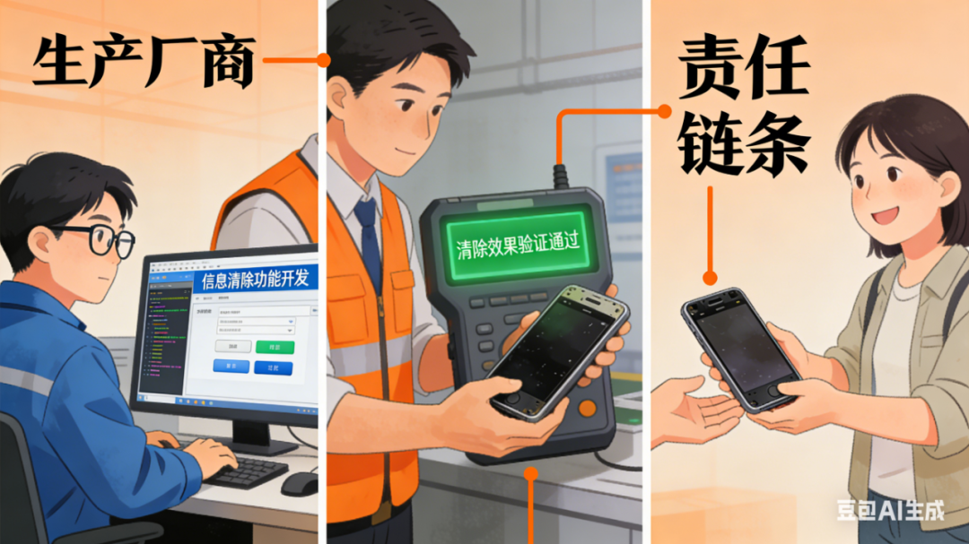 对于电子产品生产厂商,标准提出了源头治理的要求:厂商应为用户提供内置的信息清除功能。如无法开发内置功能,厂商也必须提供外部专用清除工具、可靠的第三方清除工具信息或免费的专业清除服务。操作前需明确告知用户清除范围及影响,并征得用户同意。