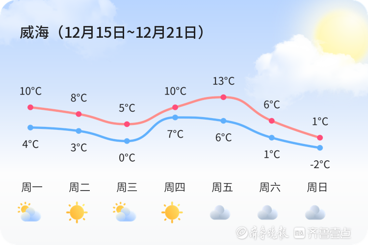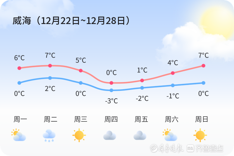 全市周平均最高温4℃,平均最低温0℃,平均气温1℃,周最高气温7℃,出现在周二、周日,周最低温-3℃,出现在周四。