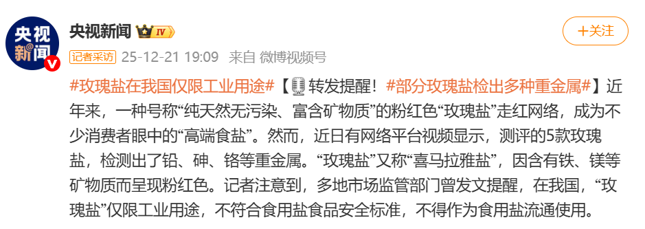 近年来网上走红的进口“玫瑰盐”实则不宜食用,专家紧急提醒