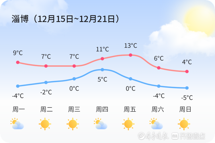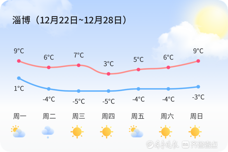 全市周平均最高温6℃,平均最低温-3℃,平均气温1℃,周最高气温9℃,出现在周一、周日,周最低温-5℃,出现在周三、周四。
