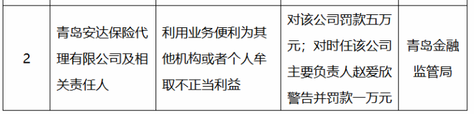 12月19日,国家金融监督管理总局青岛监管局官网公示的行政处罚决定书显示,青岛安达保险代理有限公司因利用业务便利为其他机构或者个人牟取不正当利益被罚款5万元。同时,时任该公司主要负责人赵爱欣被警告并罚款1万元。