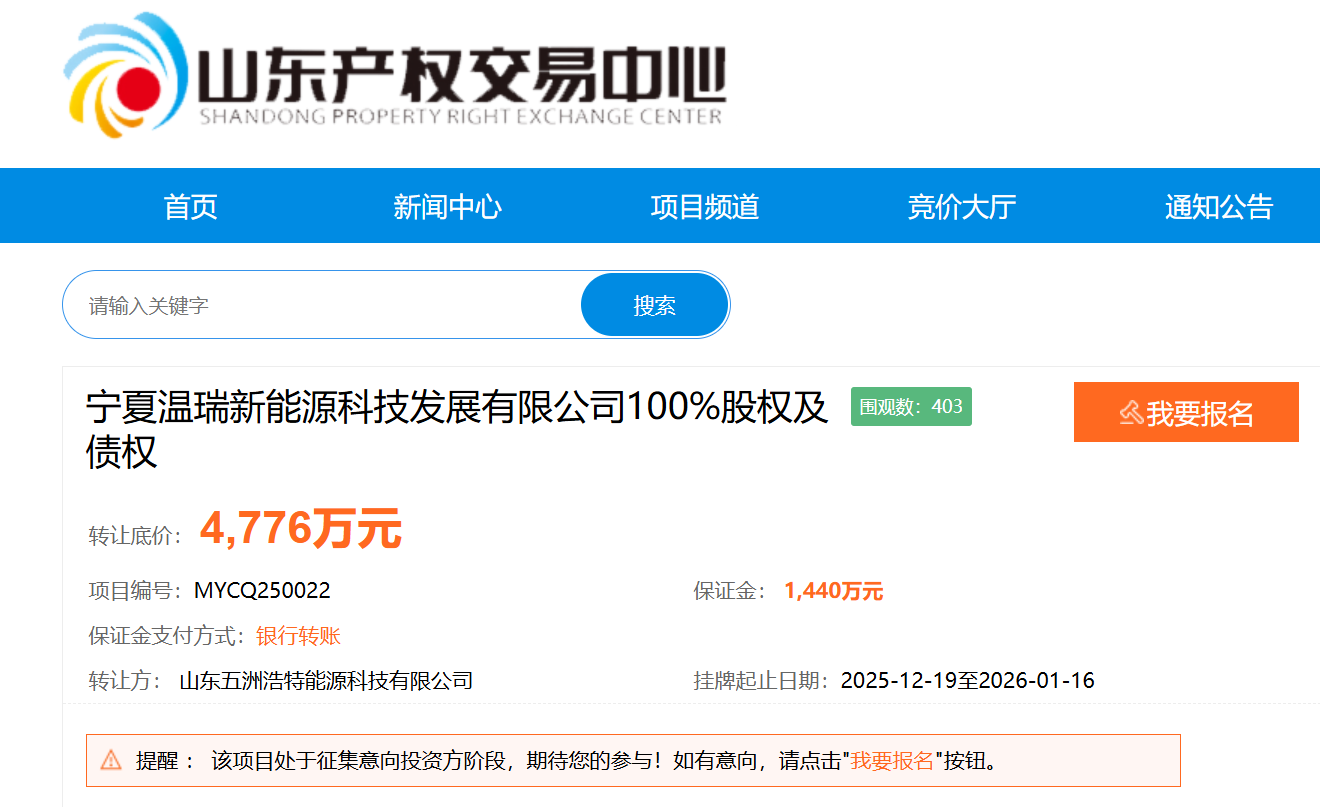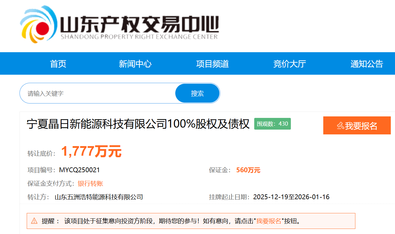 12月19日,山东五洲浩特能源科技有限公司(下称“山东五洲浩特”)在山东产权交易中心一口气转让两家宁夏企业。其中,宁夏温瑞新能源科技发展有限公司(下称“宁夏温瑞新能源”)100%股权及债权转让底价4776万元,宁夏晶日新能源科技有限公司(下称“宁夏晶日新能源”)100%股权及债权转让底价1777万元。