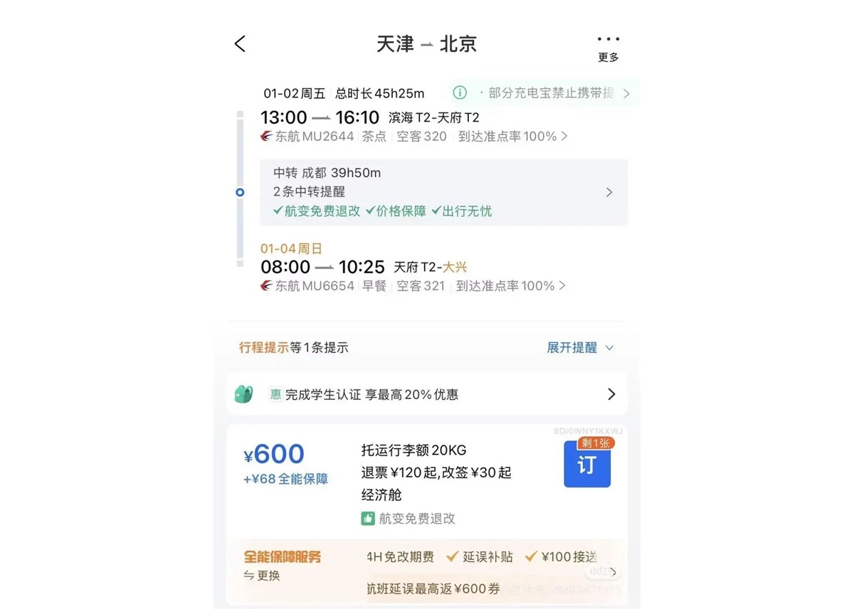 网友发帖截图,从天津经成都中转再飞往北京的机票,中转的30多个小时内,就可以在成都的街头尽兴地走一走。飞到北京后,坐动车回天津也很方便。