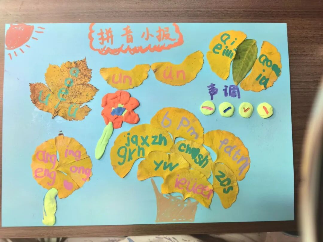 活动现场,学生化身“拼音小能手”,参与多个趣味实践环节。在拼音与自然融合的环节中,声母、韵母被藏于各色叶片间,学生们认真寻找并进行趣味拼贴,将抽象的拼音符号转化为可触摸的实物作品,开启知识“玩”进生活的快乐启蒙。