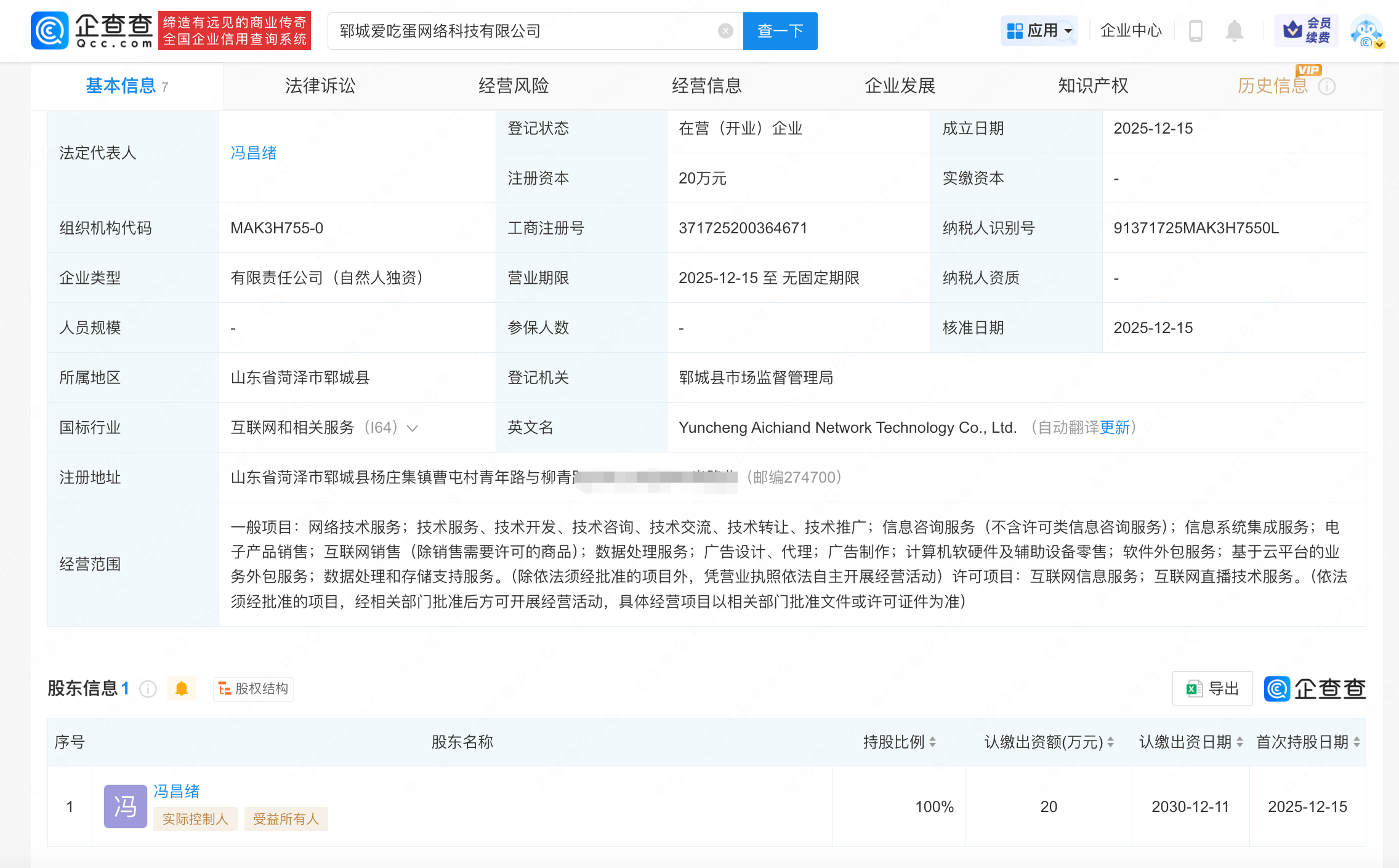 企查查APP显示,近日,郓城爱吃蛋网络科技有限公司注册成立,注册资本20万,冯昌绪担任法定代表人并持股100%,经营范围包含互联网销售、互联网信息服务、互联网直播技术服务等。据平台实名信息显示,蛋神“爱吃蛋”认证信息为冯昌绪。