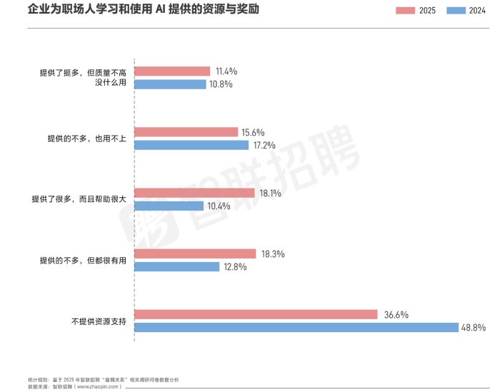 企业作为推动人工智能技术在职场中落地的关键主体,在构建AI学习与应用支持体系方面正不断加码。对比2024年的调研数据,企业在AI资源供给与激励机制方面的支持力度明显增强,表示“提供了很多,且帮助很大”的职场人比例由10.4%提升至18.1%,“提供的不多,但都很有用”的比例也从12.8%上升至18.3%。反映出企业在AI能力建设方面的投入增强,且逐步取得实际效果。