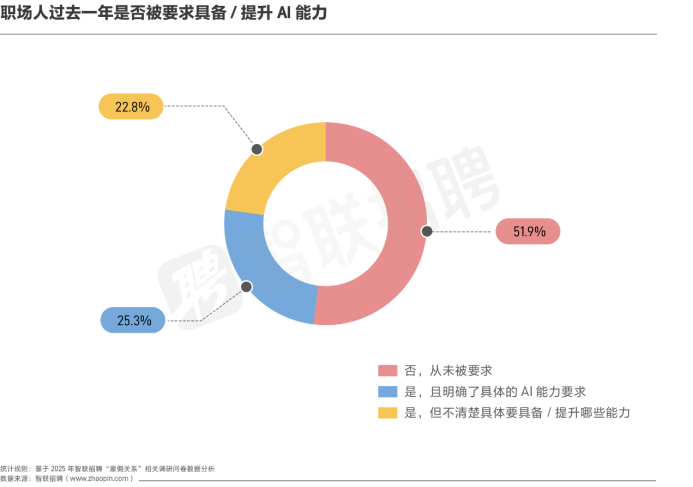 如今,AI技能已从“加分项”逐步转向“基础竞争力”。近五成职场人过去一年在工作或求职过程中被要求具备或提升AI使用能力,人机协作素养成必备素养。其中,25.3%被明确了具体的AI能力要求,22.8%陷入“有要求但无方向”的模糊状态。这一趋势倒逼职场人主动构建AI认知框架,学习如何精准提问、优化指令、评估结果可靠性,并在实践中不断调试与迭代。