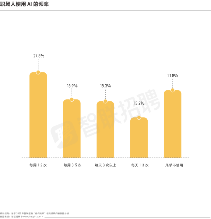 调研显示,高达78.2%的职场人每周都会借助AI开展工作,这一比例较2025年二季度的调研结果大幅提升,印证了AI在职场中的快速普及。其中27.8%每周使用1-2次,占比最高。18.9%每周使用3-5次,每天高频使用3次以上或1-3次的职场人分别占比18.3%和13.2%,他们已将AI深度融入日常工作中,人机共生的职场环境正在形成。
