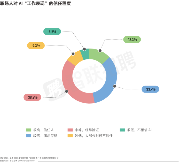 对于AI的工作表现,38.2%的职场人表示会经常验证其准确性与可靠性;33.7%表示偶尔存疑,但整体信任度较高;对AI信任度很高的职场人仅占13.3%。这表明人类需要通过实践逐步摸清AI的能力边界——哪些情况下AI可靠、哪些环节AI易出错、如何通过调整指令与结果验证降低风险,强化对AI输出结果的验证与优化能力;另一方面,AI需要通过人类的反馈不断提高“信任指数”——通过迭代算法优化输出等方式,提升准确率。只有当人类对AI的能力有了更清晰的认知,同时AI能更精准理解人类需求时,才能进一步实现“人机互信”。