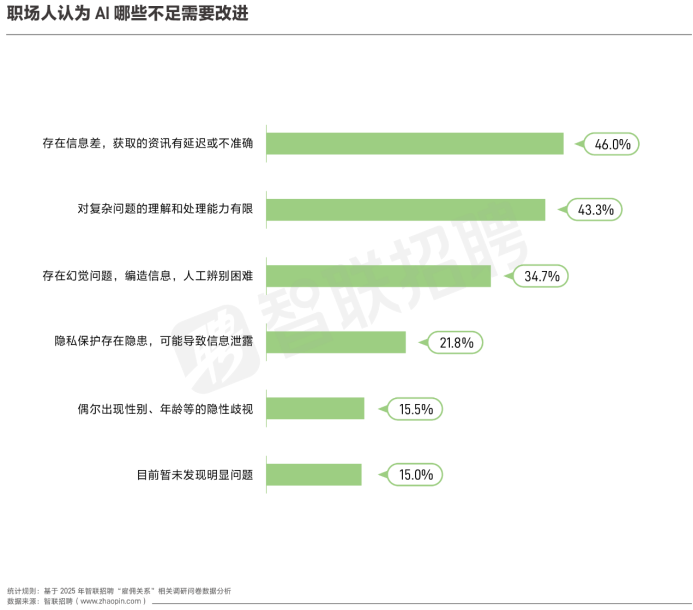 职场人对AI工作表现不信任的主要原因还是在于AI当前的“工作表现”。46%的职场人指出:“AI存在信息差,获取的资讯有延迟或不准确”是其首要不足;其次,43.3%的职场人表示AI对复杂问题的理解和处理能力有限,难以给出有效解决方案,暴露了AI在多层级逻辑推理、跨领域知识整合及情境化判断方面的不足;34.7%则表示AI在缺乏事实依据的情况下生成看似合理但实为虚构的内容,人工辨别困难。此外,“隐私保护隐患”(21.8%)与“隐性歧视”(15.5%)虽占比相对较低,但同样是制约AI深度应用的关键短板。由此可见,AI亟需在信息更新机制、推理能力、可靠性与安全防护等维度实现多点突破,才能真正成长为更加值得信赖的职场伙伴。